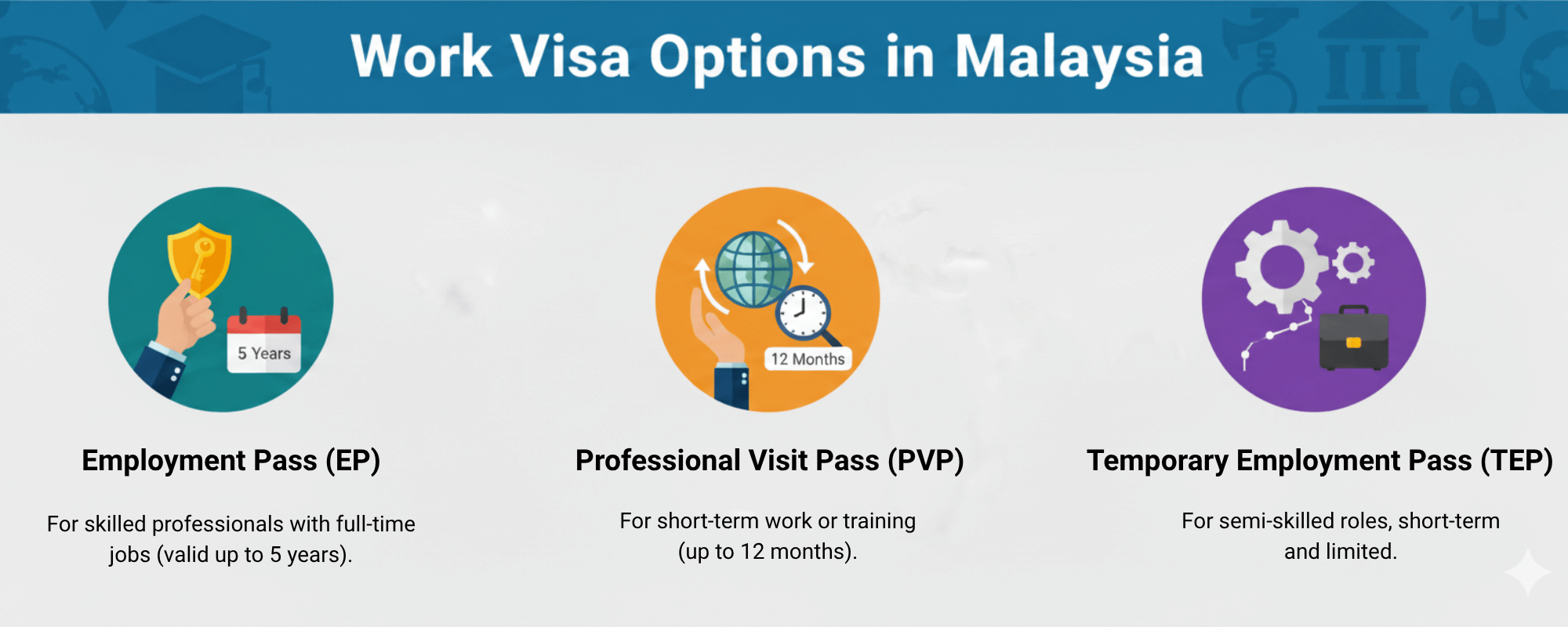 3. Temporary Employment Pass (TEP): Designed for semi‑skilled or restricted sector roles. It’s more limited and less ideal for long‑term stay.