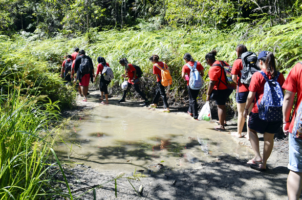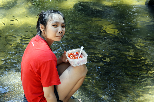 Oh no! The jungle trail ended at the river! As mentioned early, the trekking trail included 6 river crossings one-way — one over the suspension bridge at the start of the trek and another 5 in the water itself. Making the adventure more memorable were swamps and swamps of fish nibbling at their feet as they walked on slippery stone in gushing stream of water…