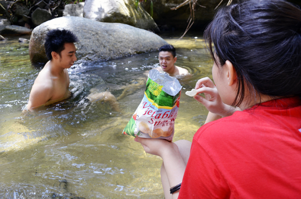 Unfortunately, there was an incident at the waterfall right when the students arrived. A boy (not from ALFA group) injured himself while playing at the waterfall. Besides that, the waterfall was mysteriously contaminated by bees. With that, the students made objective judgement and decision to leave the waterfall they have long awaited for, for a safer spot to have their lunch and bath.