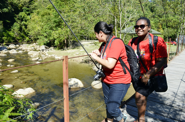 Maleeha and Anthea stopping on the suspension bridge to enjoy the view of the river.