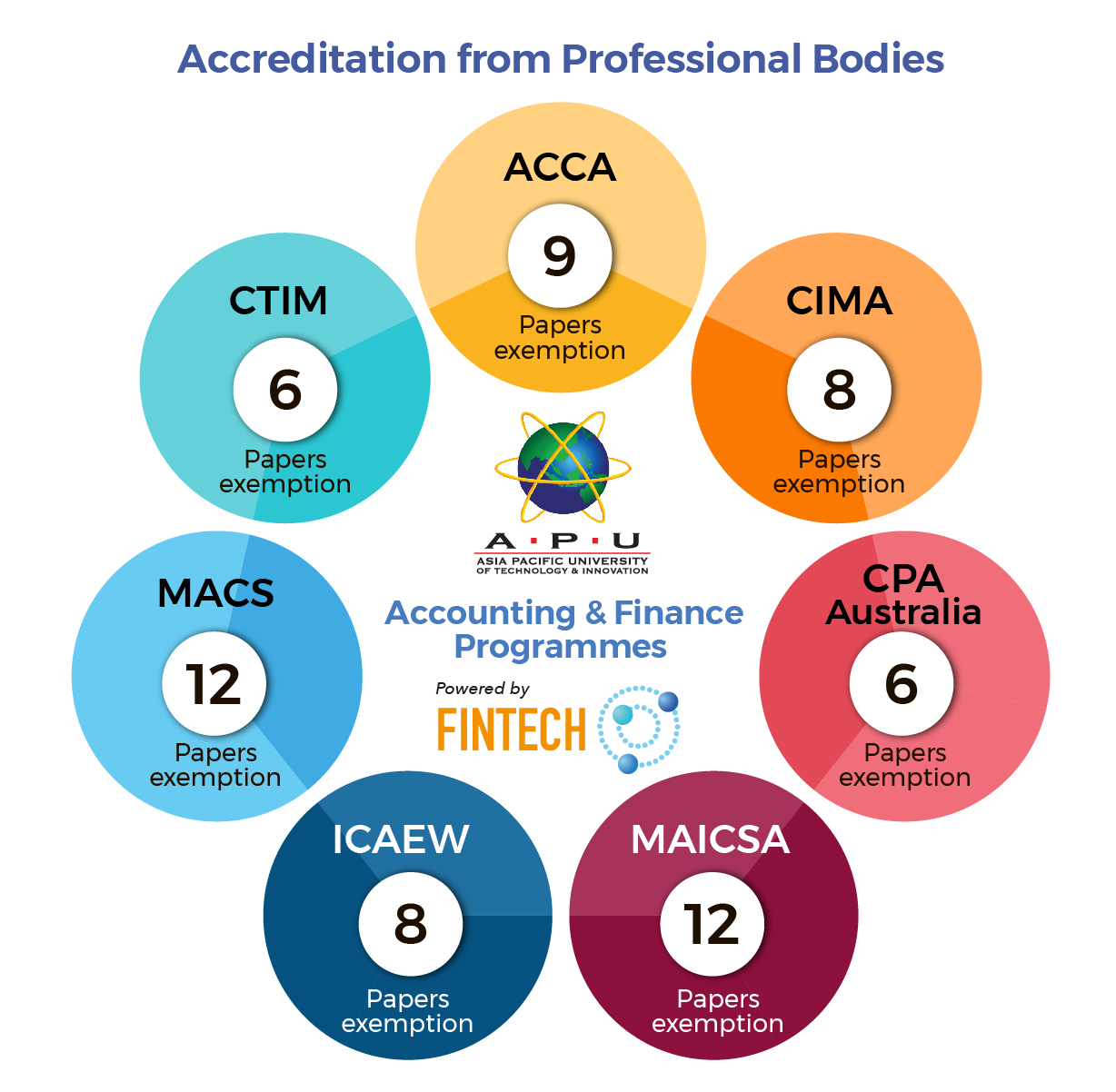 By tapping into the capabilities of industry partners, APU’s accounting and finance education offers industry-relevant courses that are widely accredited and recognised worldwide by leading professional bodies such as Association of Chartered Certified Accountants (ACCA), Certified Public Accountant (CPA), Certified Management Accountant, Malaysian Institute of Chartered Secretaries and Administrators, Institute of Chartered Accountants in England and Wales (ICAEW), Chartered Tax Institute Of Malaysia, Chartered Institute of Management Accountants (CIMA) and Malaysian Association of Company Secretaries.