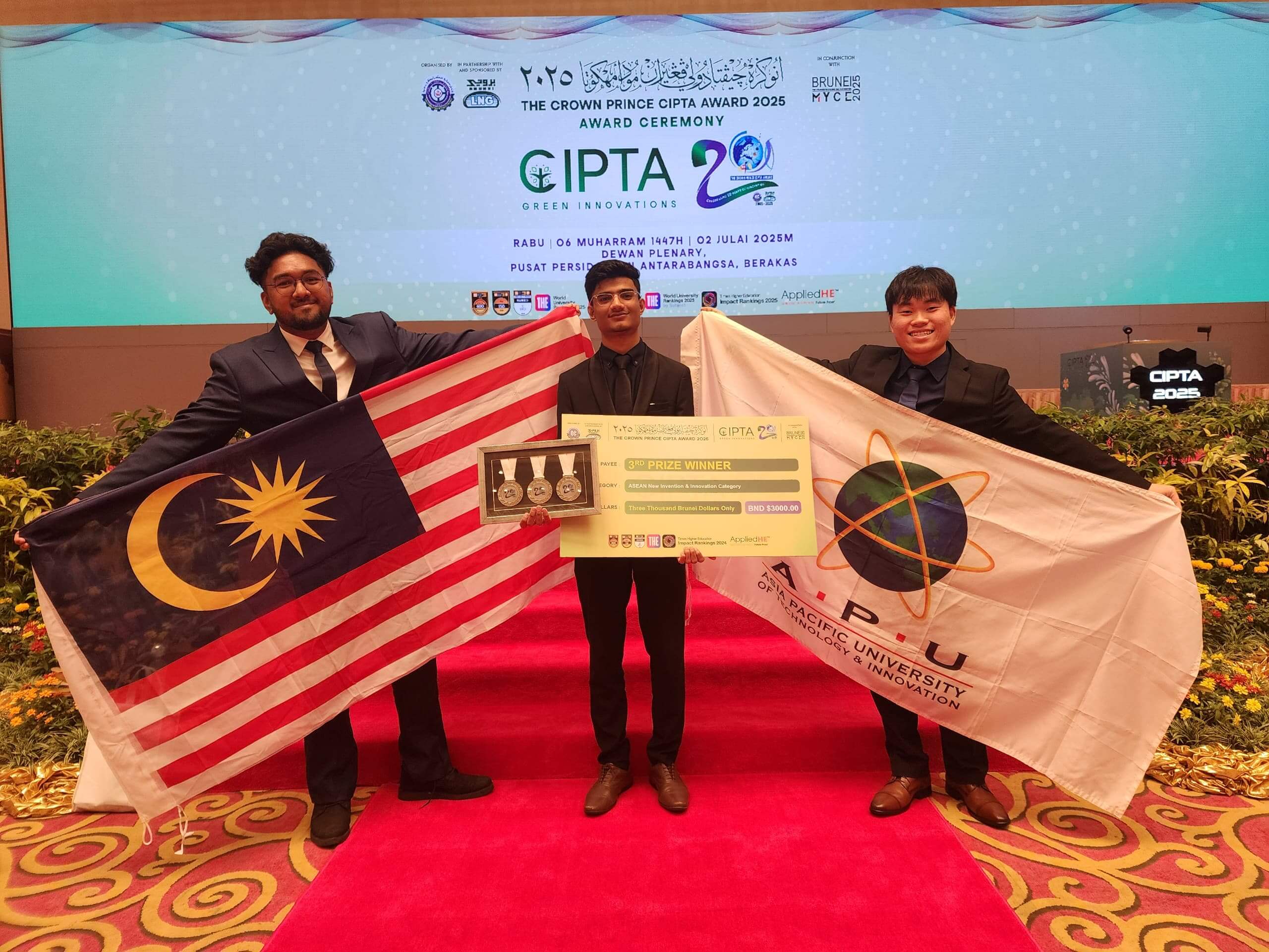 A moment of triumph unfolded at the International Convention Centre (ICC) in Brunei when Team Pulse Technologies from the Asia Pacific University of Technology & Innovation (APU) was awarded Third Place in the prestigious ASEAN – New Invention & Innovation Category at the Crown Prince CIPTA Award 2025.