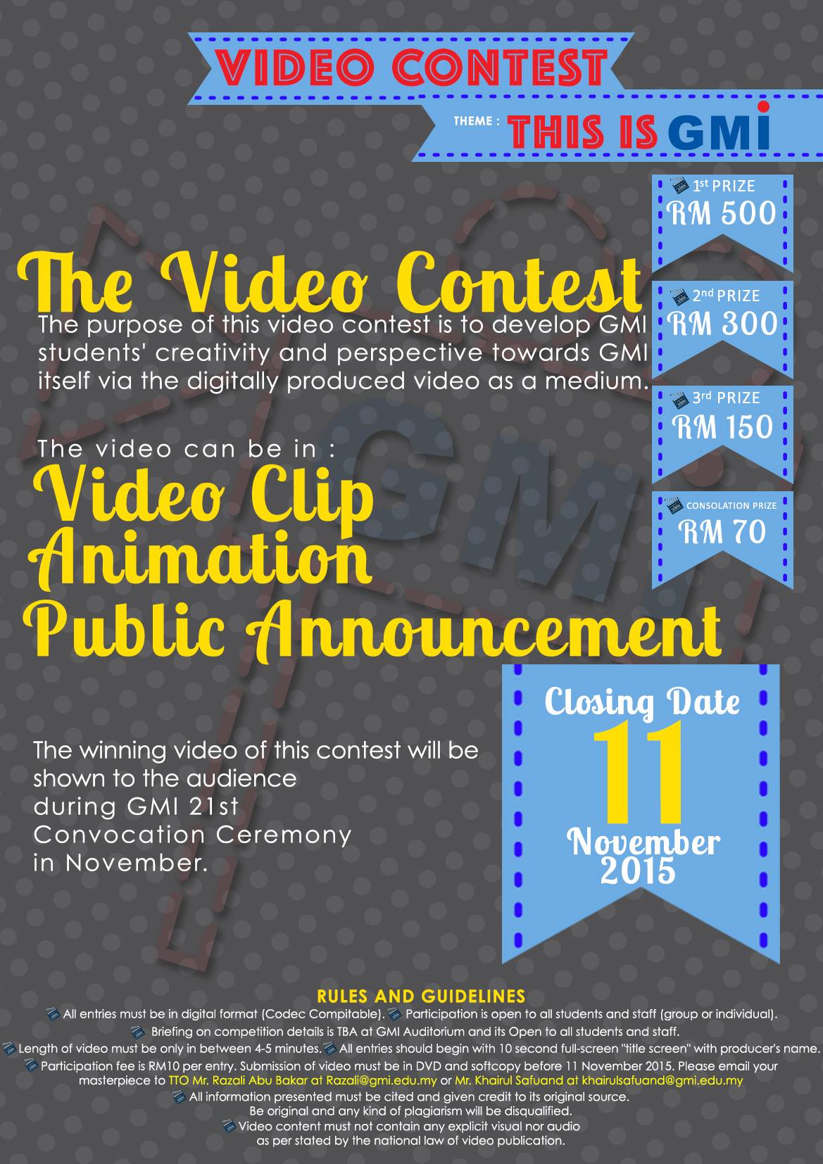 1st Prize: RM500 // 2nd Prize: RM300 // 3rd Prize: RM150 // Consolation Prize: RM70
