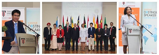 The culmination activity of International Week at the Lakeside campus was the hosting to the UN Day @ Taylor’s University for the very first time. Held in conjunction with the United Nations’ 70th anniversary, the UN Day @ Taylor’s University activity featured two key components of the SHINE (2nd transcript) Award Programme’s Empowerment Series under "Global Engagement". The day began with a Parade of the Nations as international students marched into the hall with the flag of their respective countries. Then, Ms. Michelle Gyles-McDonnough, the UN Resident Coordinator for Malaysia, opened the event by delivering her opening address on behalf of the United Nations. In the morning, and as part of the SHINE Distinguished Speaker Series, the Keynote Address on "Malaysia in a Global Community" was delivered by YAM Tunku Zain Al-'Abidin ibni Tuanku Muhriz (Founding President of the Institute of Democracy and Economic Affaires). In the afternoon, a Global Perspectives Seminar on the "Condition of Human Rights in Malaysia" featured both Datin Paduka Marina Mahathir (member of the Board for Sister of Islam) and Mr. Steven Chan (Founder of Malaysian Glaucoma Society and Dialogue in the Dark, Malaysia). Throughout the day a competition for Global F.A.C.E.s: For-A-Cause Exhibits was also held. This was a platform for various groups of students to create interactive exhibits that highlight various global issues. Nine groups participated in the competition including those highlighting corruption, pollution, human trafficking and so forth. For more information about SHINE please visit Taylor's University official website.