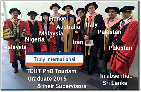 At the recent Taylor's University convocation ceremony, five PhD students being supervised through the School of Hospitality, Tourism and Culinary Arts graduated. Not only was this the largest cohort of PhD students in hospitality and tourism to date, but it was also the most globally diverse. The five students came from five different countries, namely Sri Lanka, Iran, Nigeria, Pakistan and Malaysia. Not only does this highlight the breadth of international students at Taylor's University, but each of their five supervisors were also from a different country. They came not only from Malaysia, but also from Italy, France, Pakistan and India. While the students focused their PhD studies on a variety of international research topics, a number of them have also contributed to deepening the understanding of tourism in Malaysia. For example, Dr. Jeetesh Kumar (who is originally from Pakistan) looked at "Investigating the size and economic value of business events in Malaysia: A national level perspective", and Dr. Rokhshad Tavakoli (who is originally from Iran) focused on "An Ethnographic study of social capital in Malaysian homestays: Exploring the host gaze". Meeting with the graduates after the ceremony, Professor Perry Hobson, the PVC of Global Engagement, commented that, "this group of graduating PhD students highlights the diversity of the globally community we have at Taylor's University. Not only in terms of international students, but also international academic staff".