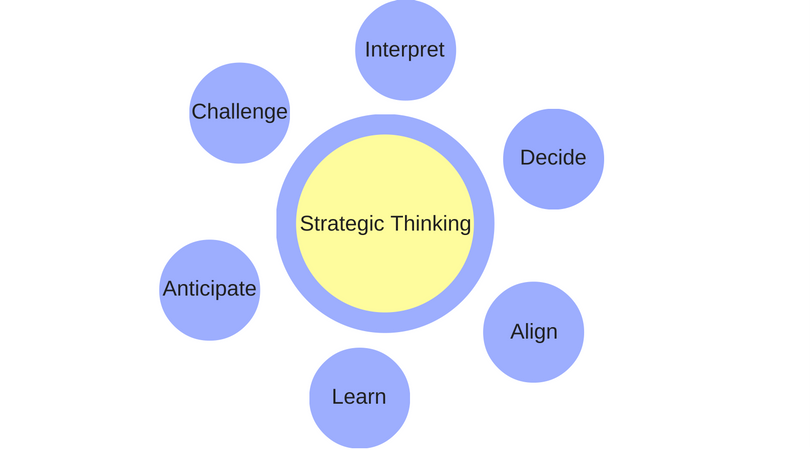 Even though strategic thinking might be the most important skill you need to have within a corporate organisation, not everyone thinks strategically. The organisation will go bankrupt if you do not foresee the future to prevent problems. Strategic thinking consists of the ability of six key elements: anticipate, challenge, interpret, decide, align, and learn.